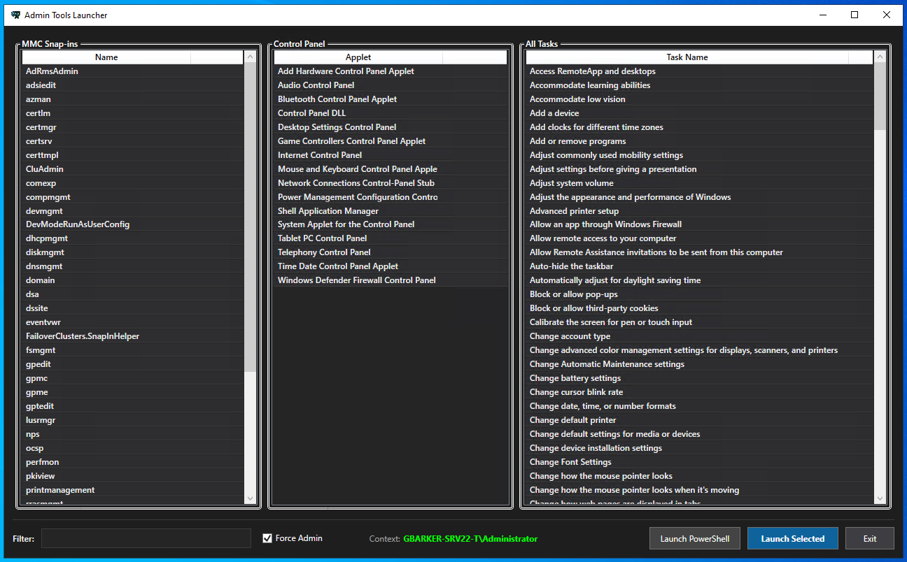 The launcher scans for common RSAT-type tools in C:\Windows\System32. If RSAT is installed, those tools will appear. If it’s a bare-bones member server, they don’t. It organizes everything into three searchable columns: